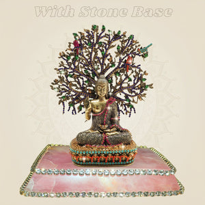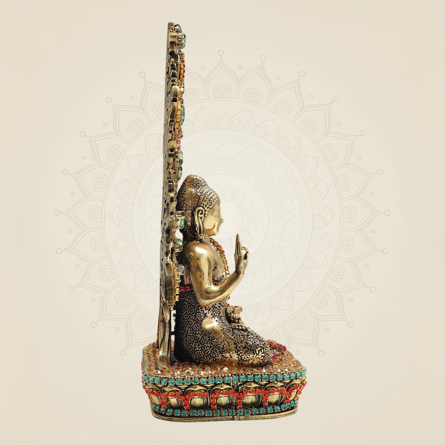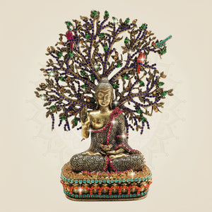 Brass Buddha Statue Under Bodhi Tree 6.5" with Fine Jewellery Stone Work